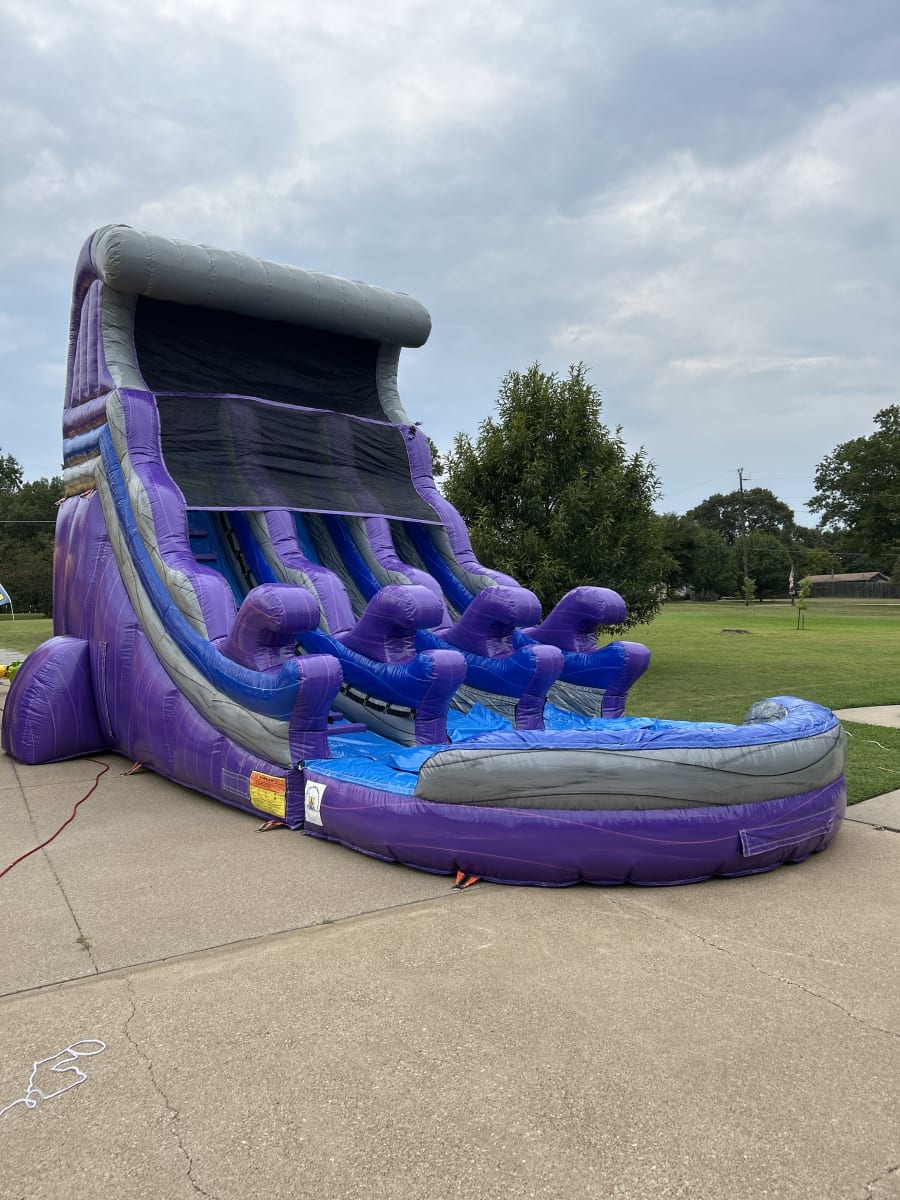 Looking to elevate your next community event, birthday bash, school field day, VBS, or benefit? The 20 Foot Dual Lane Purple Rush Water Slide is the perfect centerpiece for unforgettable outdoor fun! At Tents, Events and Party Rentals of East Texas, we are your inflatable headquarters from games, bounce houses, water slides, obstacle courses, and our popular combo units. This dazzling water slide delivers excitement, safety, and a pop of vibrant color to any gathering or celebration.