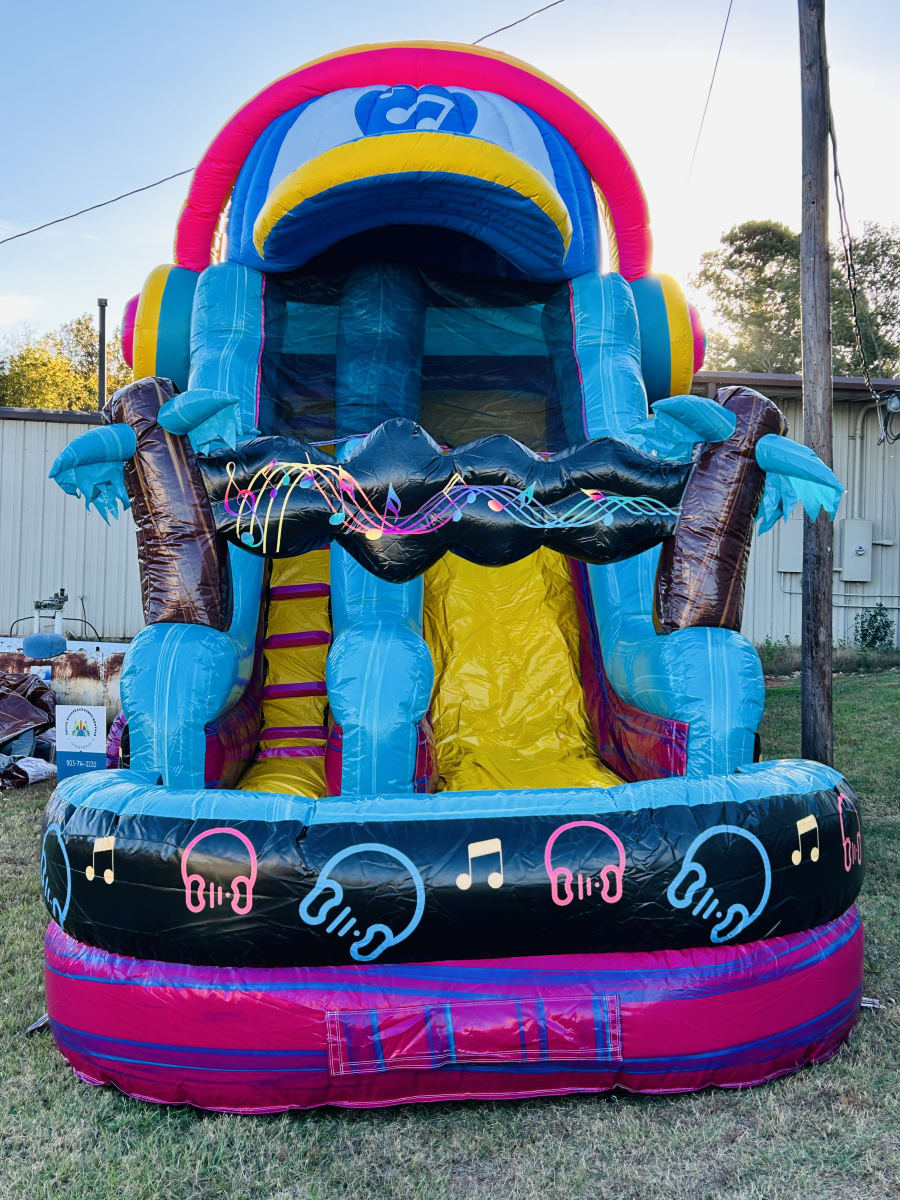 The 19 ft single lane headphone water slide delivers high-energy fun in a compact package. This single-lane inflatable combines a towering 19-foot drop with headphone-themed graphics for a unique visual punch. Fast rides. Safe design. Easy setup. Perfect for backyard parties, community events, and summer festivals. 🎉